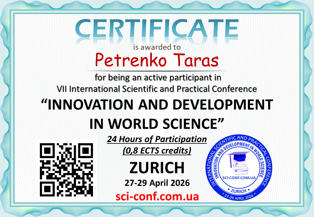 Тези учасників будуть опубліковані у збірнику із присвоєнням ISBN 978-3-954753-21-5 та УДК, вихідні дані м. Цюрих, Швейцарія, випуск в електронному варіанті (Conference PROCEEDINGS) буде доступний на нашому сайті не пізніше 7 травня 2026 року.